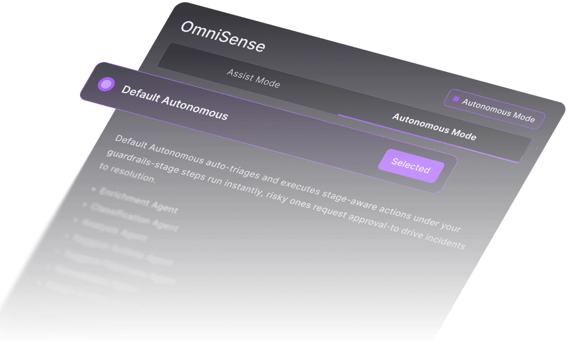 Not just AI-enabled, we're AI-native. OmniSense doesn’t only assist, it decides. Multi-agent orchestration + proprietary models give you a SOC that learns, adapts, and defends in real time.
